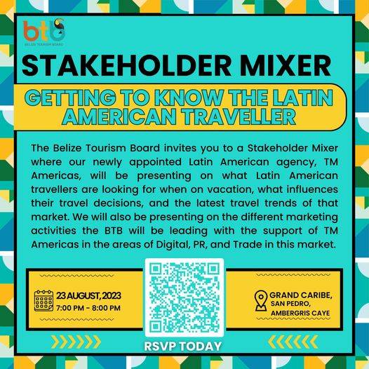 The Belize Tourism Board invites you to our Stakeholder Mixer at the Grand Caribe in San Pedro, Ambergris Caye. Get to know our newly appointed Latin American Agency, TM Americas, as they will present on Latin Americans' travel trends and travel decision influences. Join us Wednesday, 23 August 2023, from 7:00 pm to 8:00 pm.